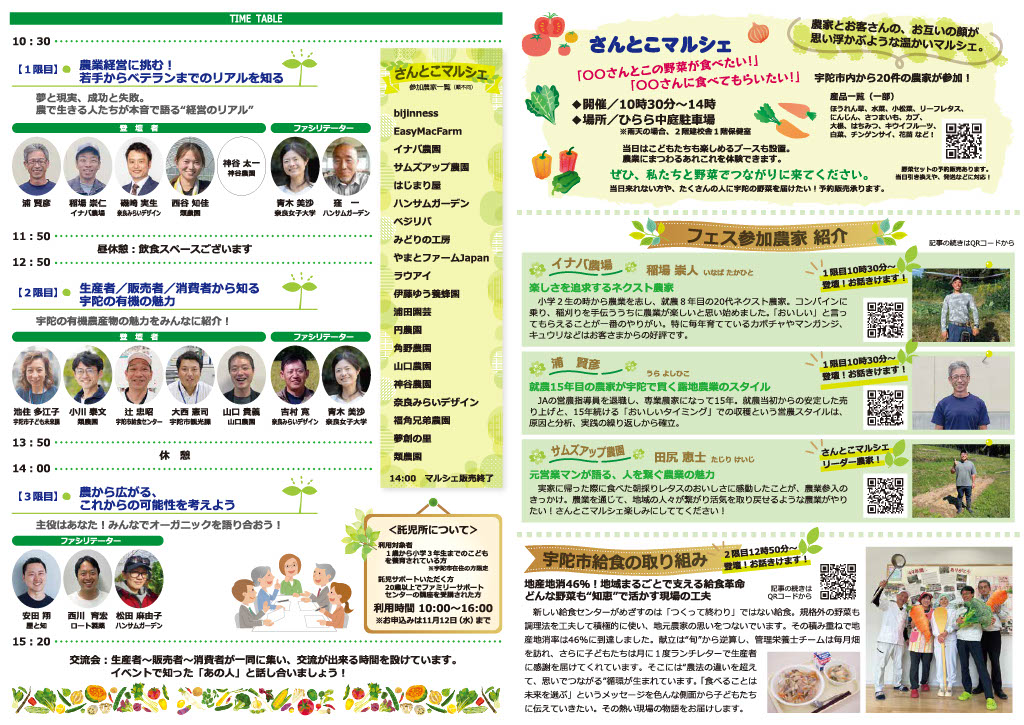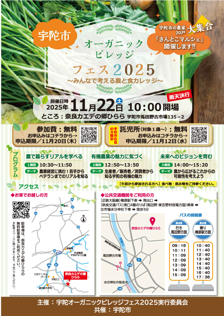 開催場所は『奈良カエデの郷ひらら』。オーガニックに関する授業が3つ行われ、恒例の宇陀産野菜や加工品を販売する『さんとこマルシェ』も同時開催となります。20軒の農家が集まる大きなマルシェで、雨天でも場所を変えて開催されるので安心。