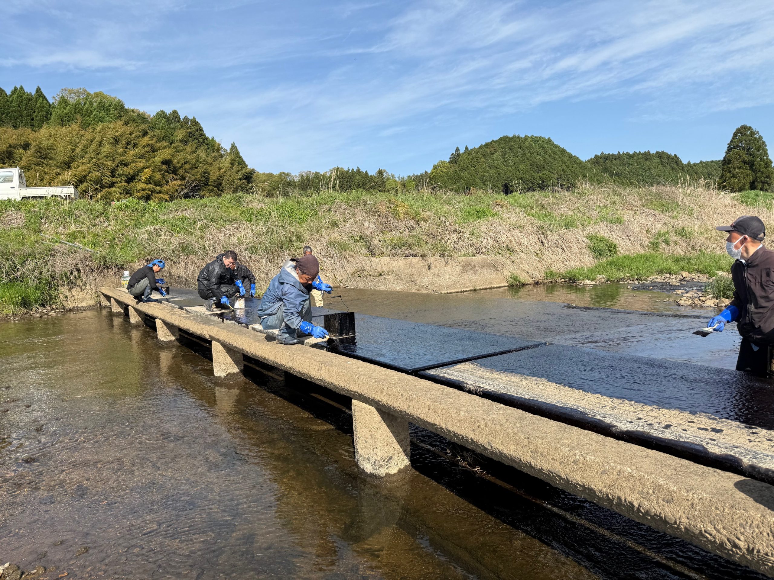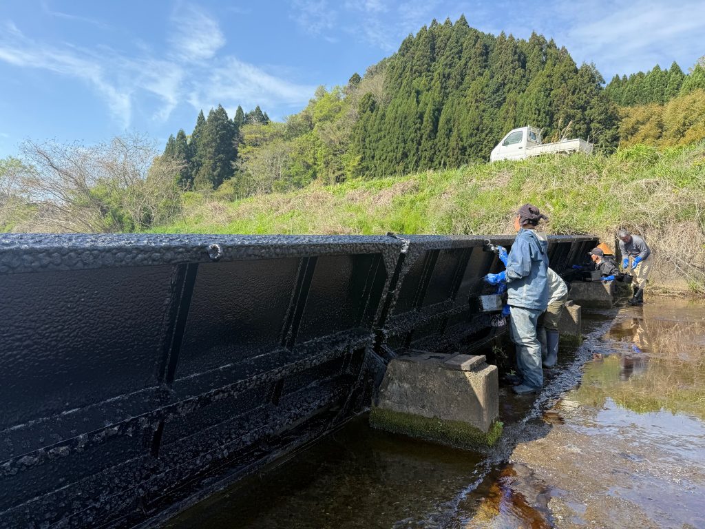 井堰は常に濡れている&野晒しで紫外線バチバチなので通常の塗料だと速攻で剥がれてダメになります。